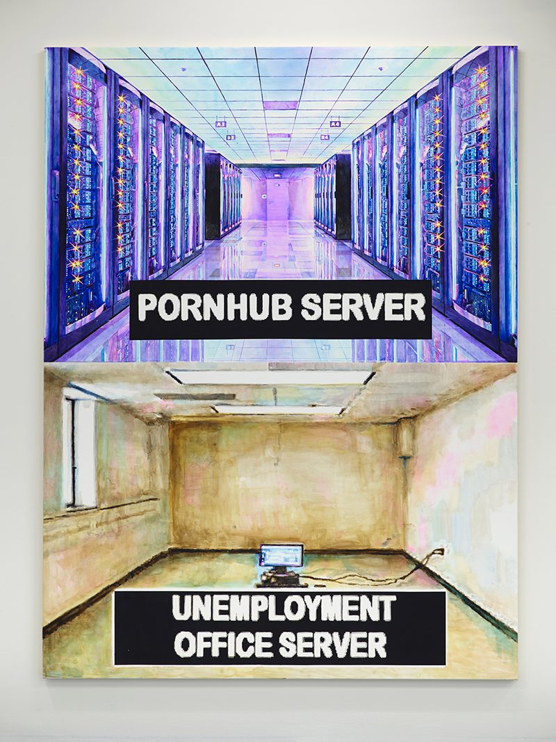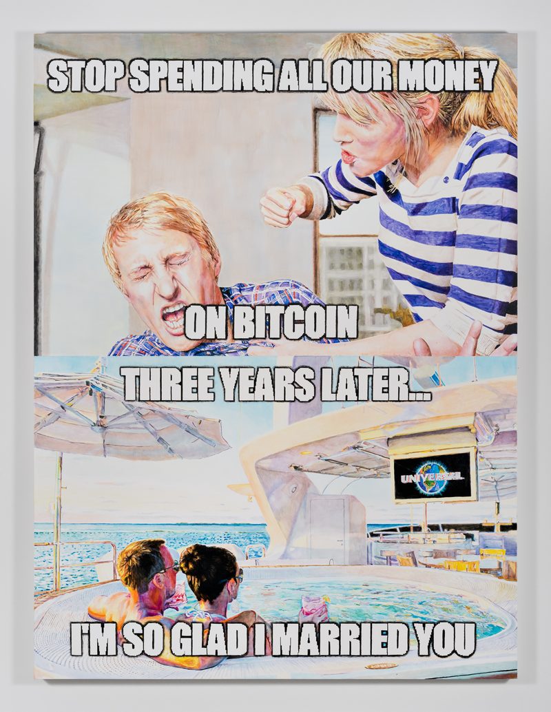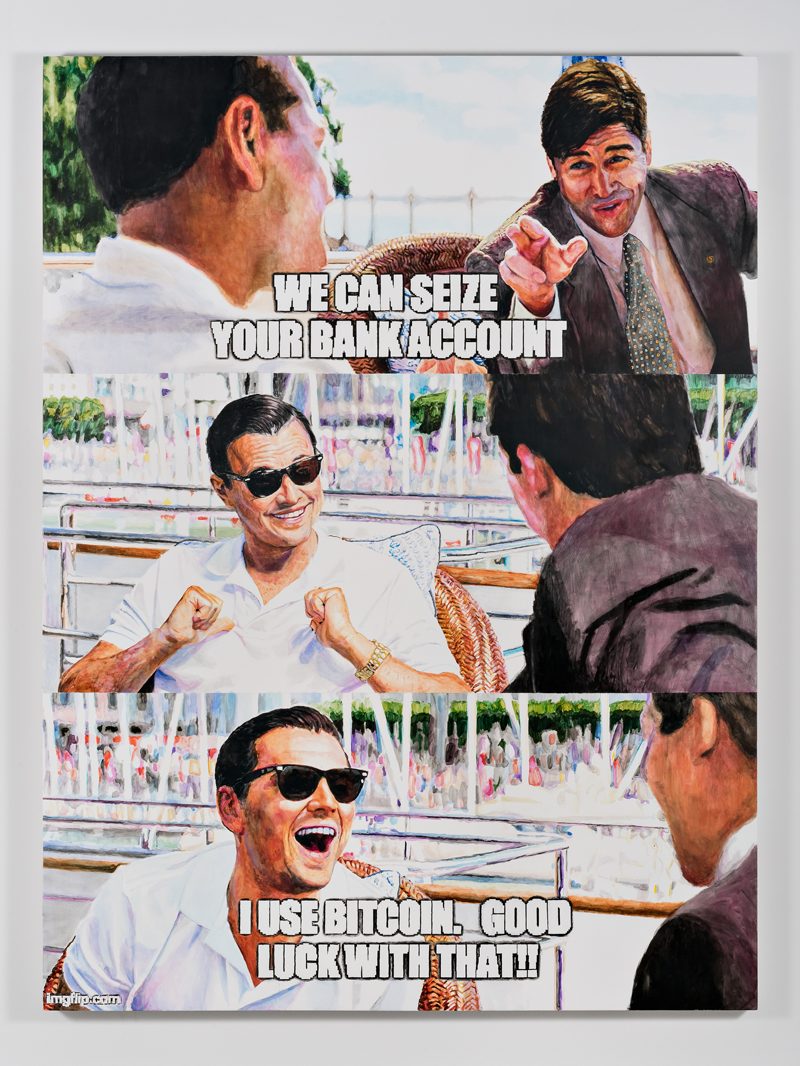 Memes are increasingly part of my reality. Every morning I doom-scroll on Instagram and look at memes—my meme paintings are modern-day still-life paintings in this way. I see them as a form of documentation of the history we’re currently living through. Memes reveal the failing nature of capitalism and our society at large, and voice personal experiences and perspectives. This combination creates a familiar and relatable experience for the viewer. I am interested in painting memes because they are a growing form of reality, especially as we are going through the coronavirus pandemic and asked to stay in our homes every day. Our worlds become increasingly less physical and more digital—pre-pandemic included, but now more than ever.
