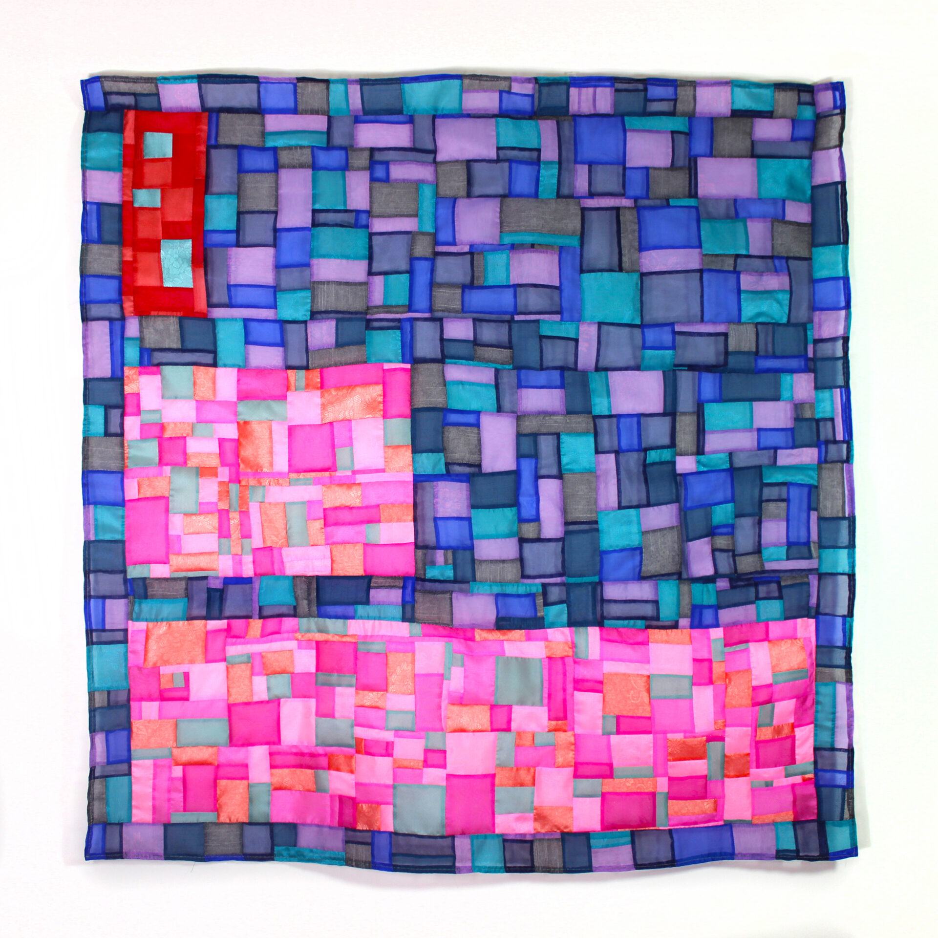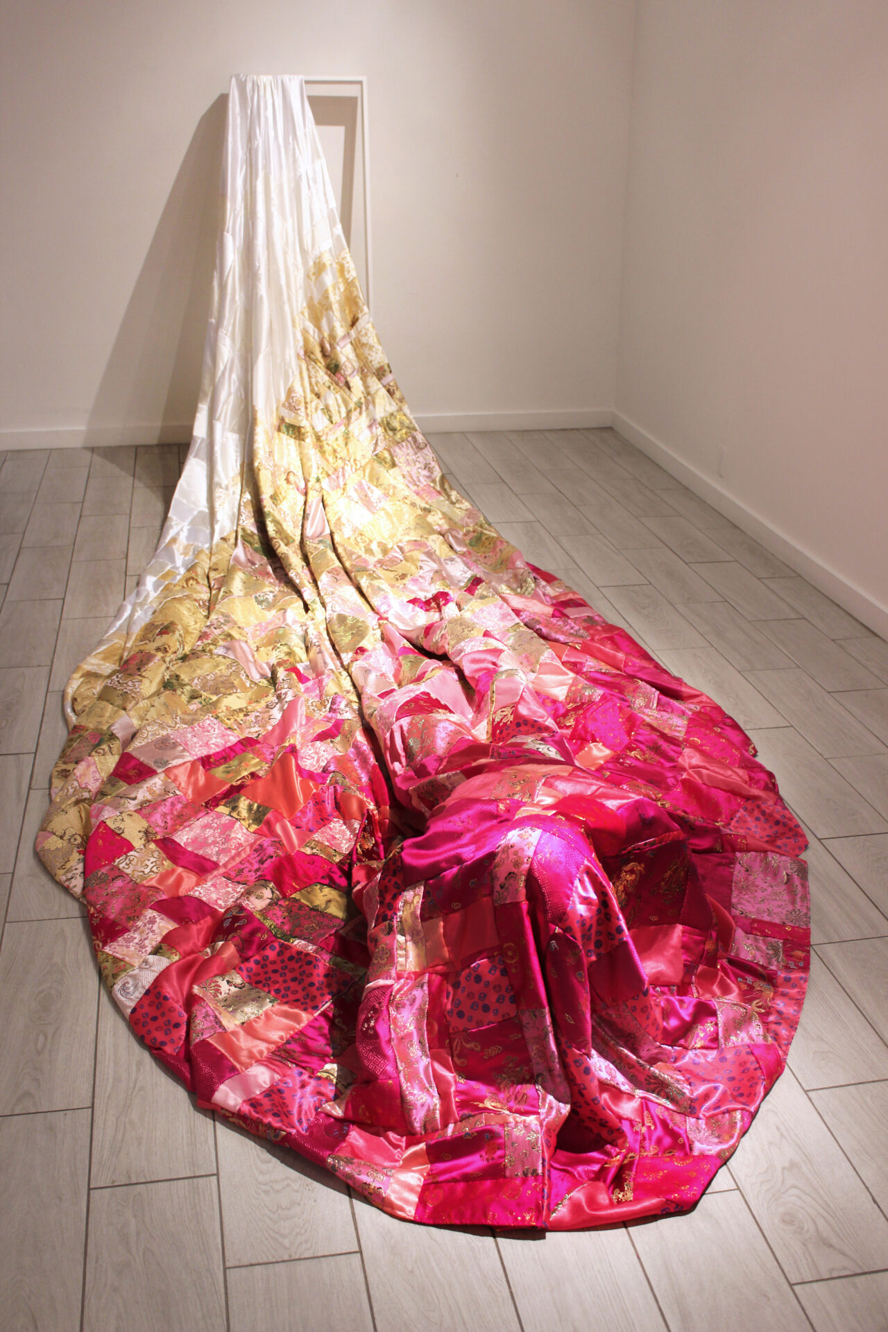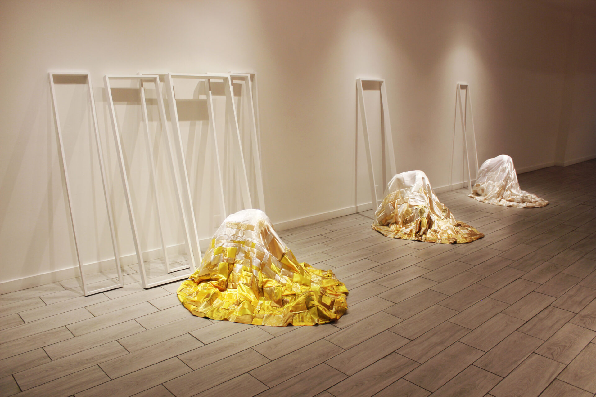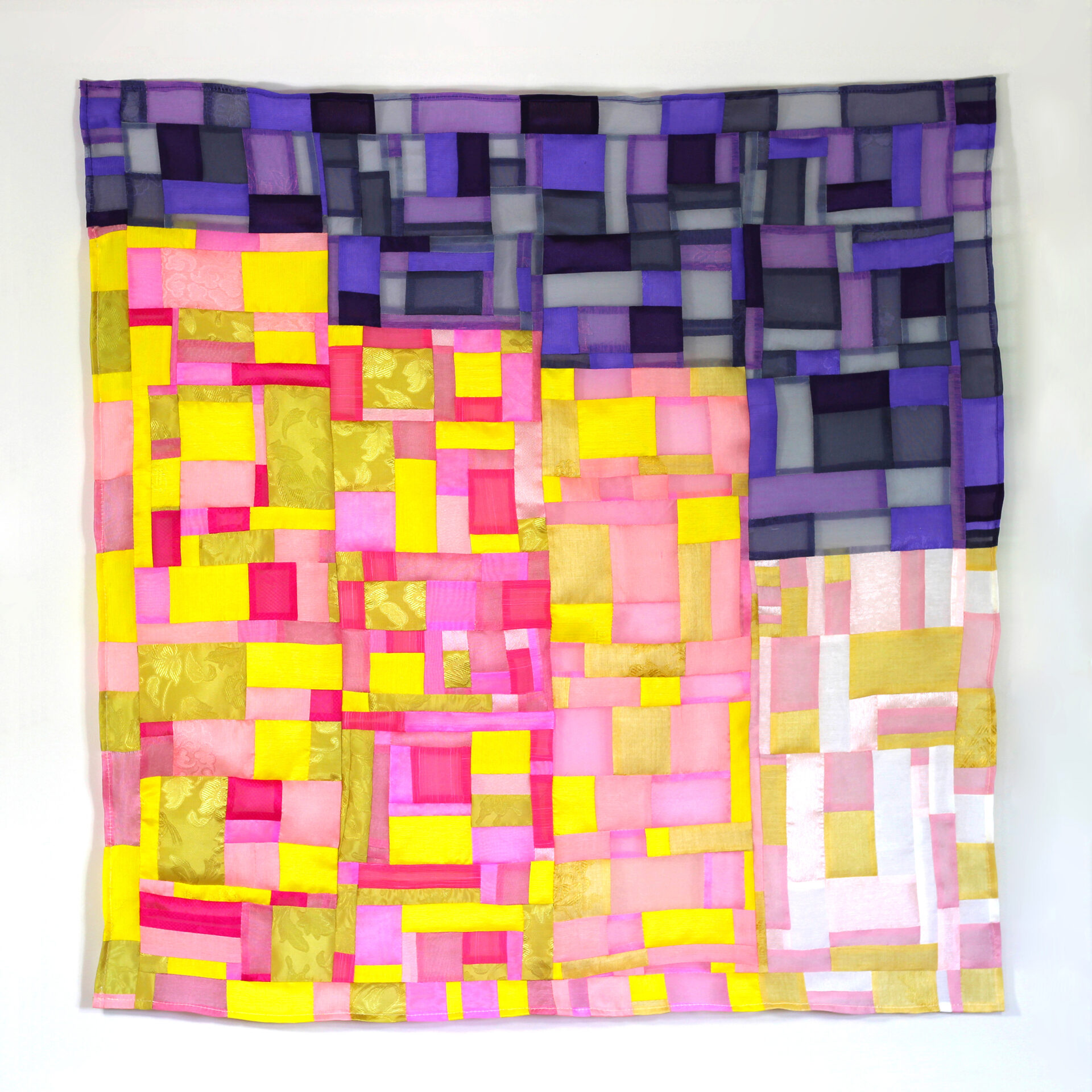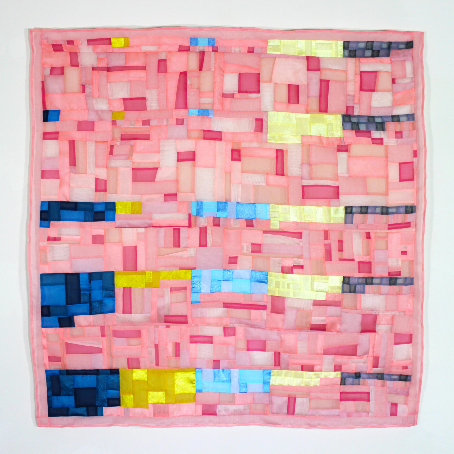 I sew patchwork textiles in the format of interpretative bojagi—Korean object-wrapping cloths historically created by Korean women who had limited contact with the outside world during the Joseon Dynasty (1392–1910)—to consider ideas such as tradition, craft, and feminized labor, and resist the notion of reductive, easily legible identities. I wrap hollow human-scale figures with object-wrapping cloth to comment on the objectification of Asiatic female bodies. Textiles are activated in relation to the frame, which become metaphors for framing and societal expectations for the authentic. Color gradients that turn to white comment on erasure and whitewashing. I integrate patterns from contemporary sociopolitical events into the textile design to question preconceptions on cultural purity, authenticity, and otherness. I examine local, national, and international issues and events to not only underscore the interconnected systems of oppression, but also argue for more capacious possibilities for one’s identity and sense of community.