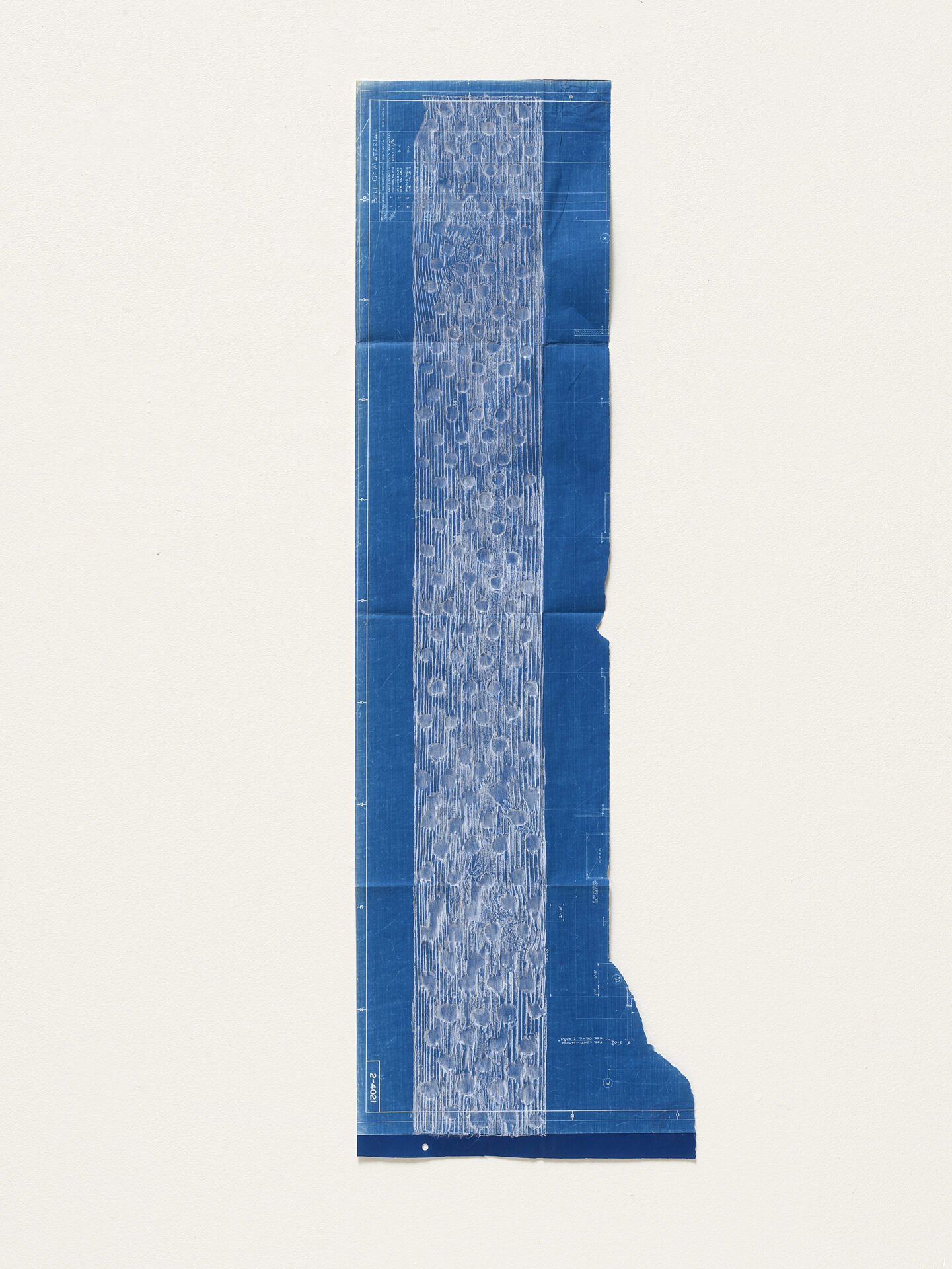 Acorn Study 10 (blueprint), 2023, Colored pencil on diazo print, tape, 6 x 4 inches