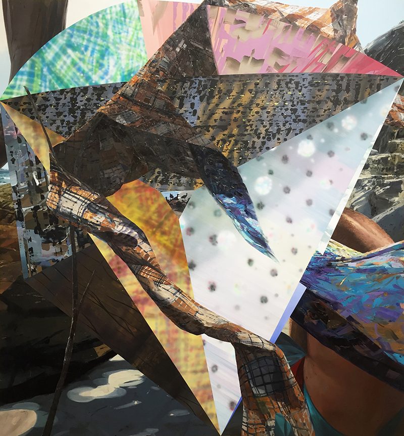 My work often appears at first to function like a dense and colorful abstract painting, but contains representations of nameable things and places. I work with color and space to reflect the mechanisms of sensation in the body, to inspire a feeling of motion, and to continually reward the investigation of pictorial space. The paintings are first about the pleasure of looking; I’d like to make paintings that make the viewer feel as though they have super powers. I am inspired by experiences where the present is marked by intense but indeterminate sensations of beauty mediated by the plasticity of memory, cognition, sensation, and future intentions. By representing how memory is constructed and perceived, there’s an opportunity for a painting to show how the feeling of one’s location is actually always the feeling of multiple locations. We make the present out of the sensed, residual, and formative.