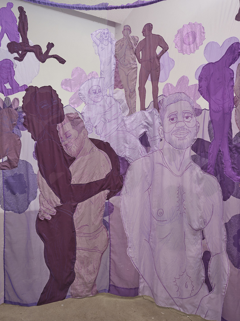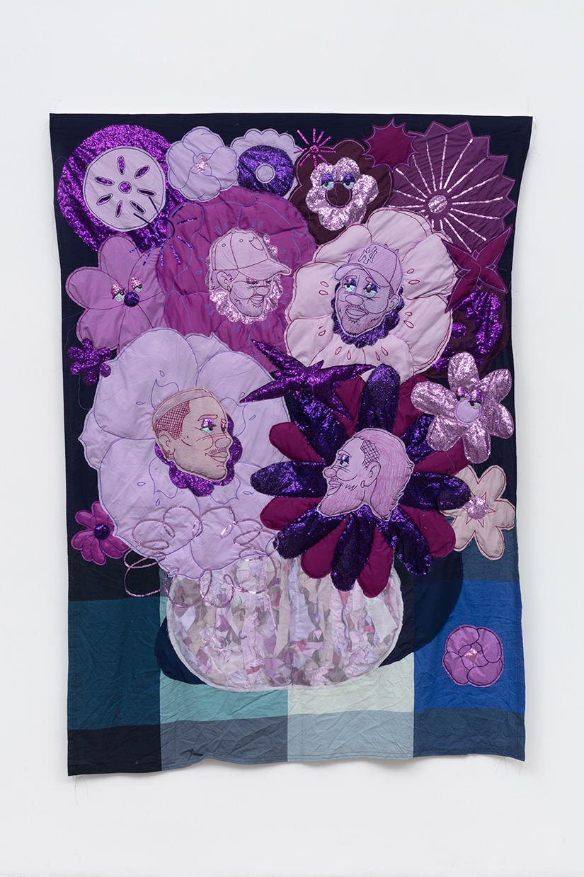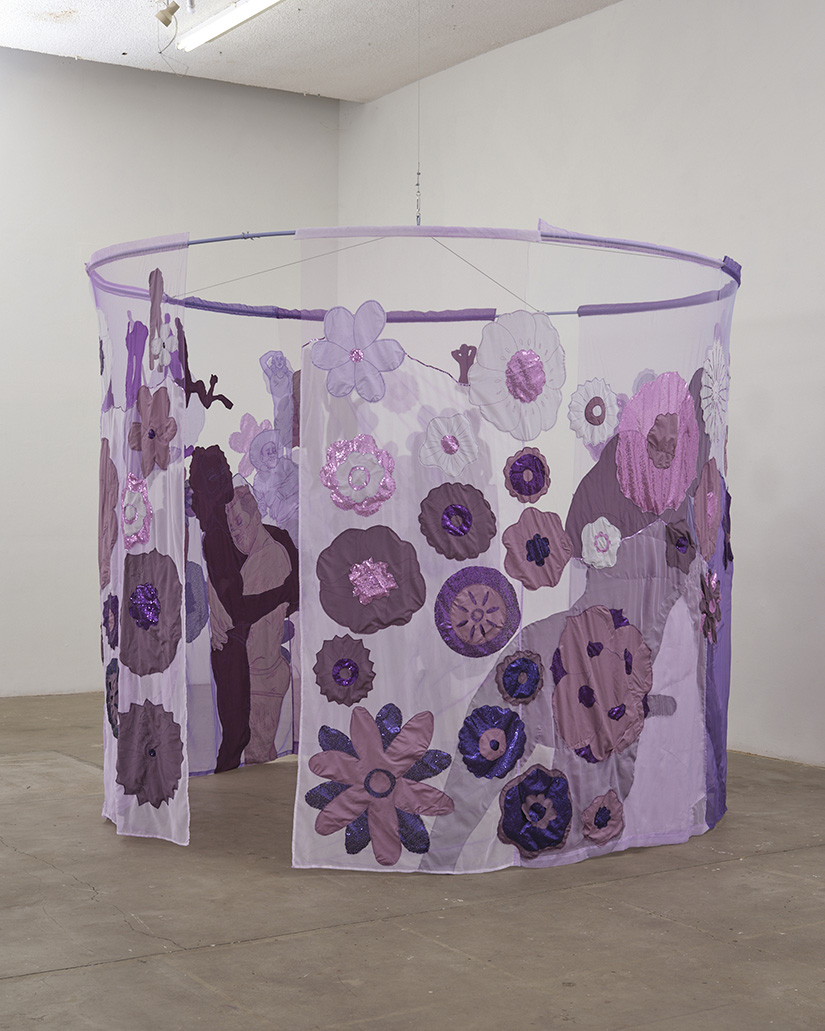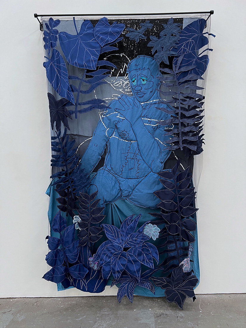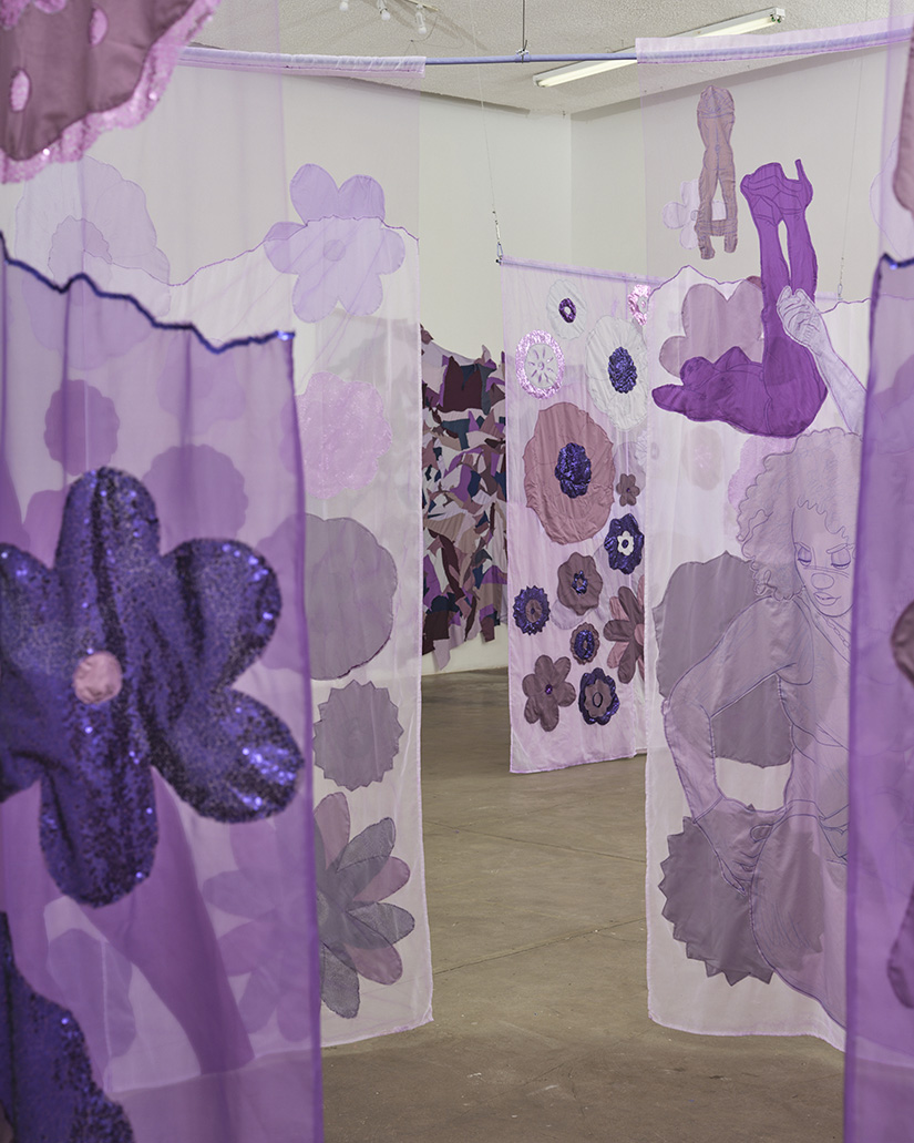 In my stitched narratives cartoon-like figures rest in dreamscapes wrapped in exploding flowers or hide behind curtains of fabric foliage that flip between embellishment and camouflage. Monochromatic dark blues reference nocturnal settings to create a feeling of hiding in the dark (in the landscape, at the disco, in the closet) and grants the viewer limited visibility. While works made in shades of purple and lavender symbolize more open and joyful spaces.