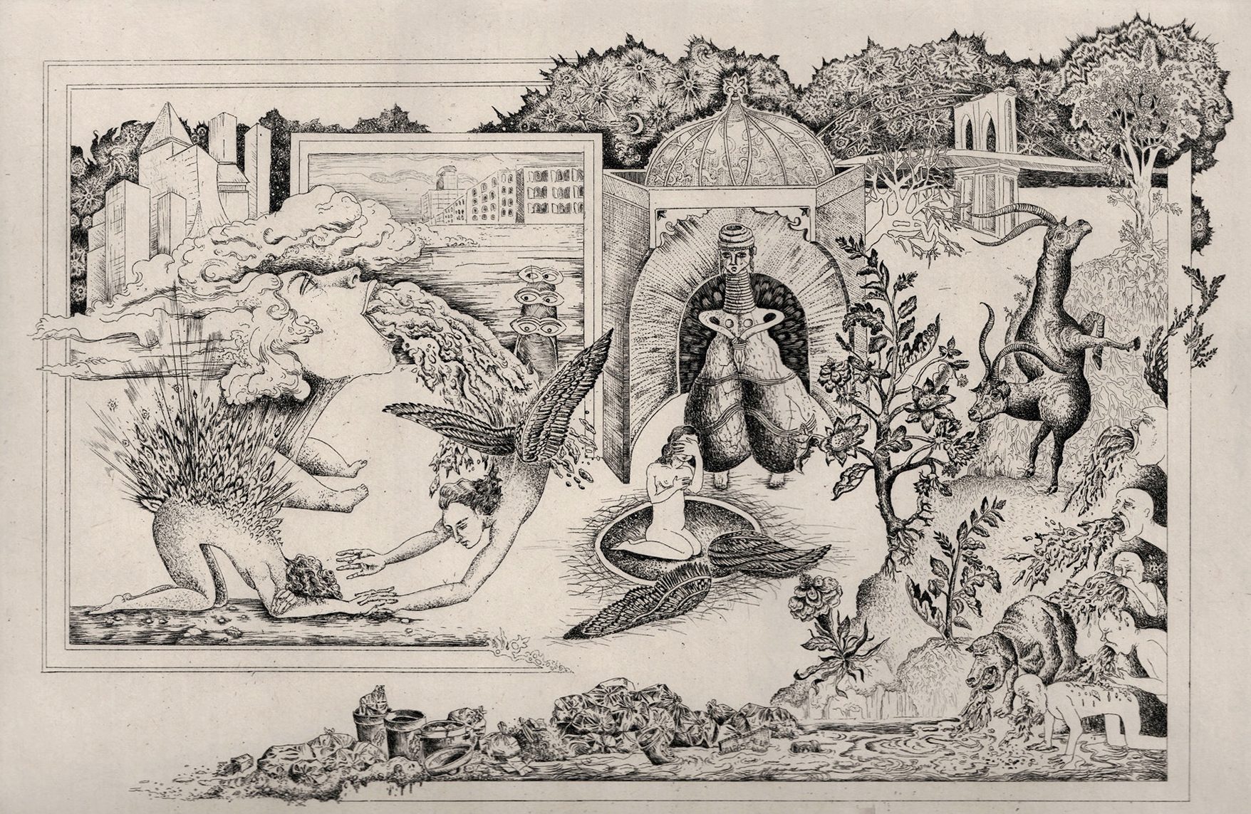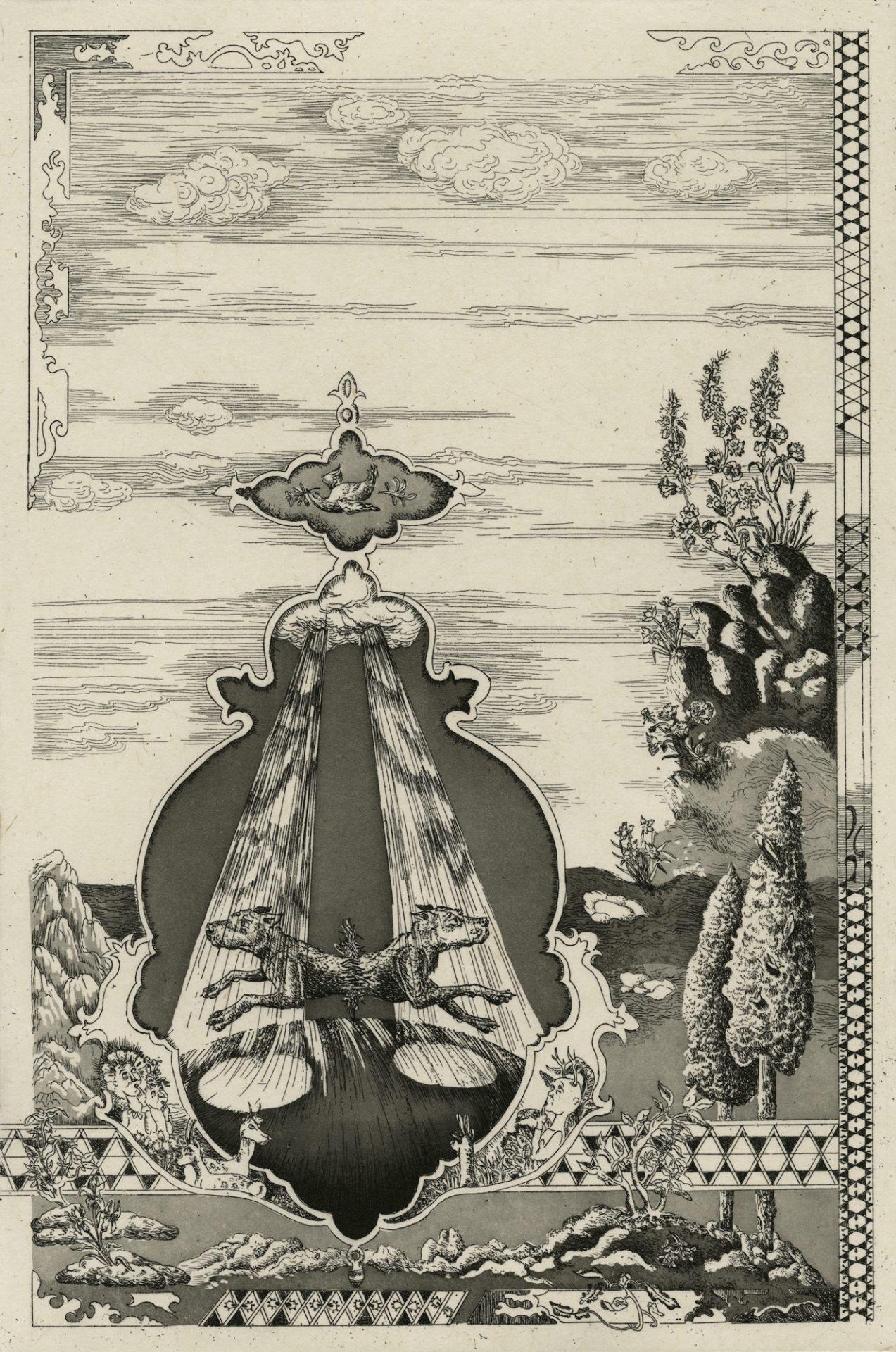 Over the past three years I’ve been developing a body of miniature etchings often presented in an installation format with murals specifically created for each piece. The compositions and imagery are inspired by 16th and 17th century manuscripts of Iran. Hoopoe, a significant bird from Attar’s book, The Conference of The Birds, is a reoccurring figure in my images. The Hoopoe was a messenger of unity. I’m calling on Hoopoe to make a comeback and offer its wisdom to our divided world. While some animals represented in my work are randomly picked, others were seen around my studio in the Marin Headlands. There’s an indisputable perfection in the execution of the original manuscripts. My efforts in transplanting the patterns, poetry, and imagery aim to create an interweaving conversation between each of the pieces that traditionally stand alone in the manuscript.