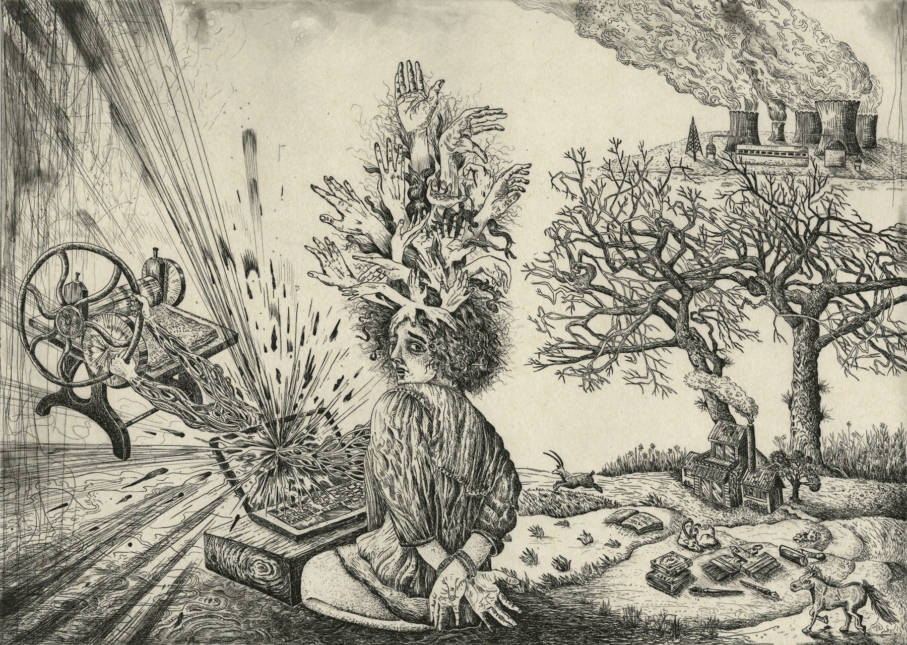 I am a narrative visual artist that primarily works on paper. My ideas develop from drawings into more embedded forms by the process of etching. Headlands has enriched my narratives with qualities specific to its surrounding environment. The light is magical and playful, the silence deep and heavy with dreams. Vegetation, wildlife, and birds appear as metaphors and symbols in my stories. The ocean connects me to my hometown by the Caspian Sea. The fog is a soft blanket that embraces the self, the creation, and the place in unity. In my remaining time I will continue making work following the miniature series I have been creating the past three years. Having a dedicated studio has made it possible to extend my visions in physical size. I’m working on a series of wooden panel designs that will contain the etchings, resembling an amplified page of a manuscript.