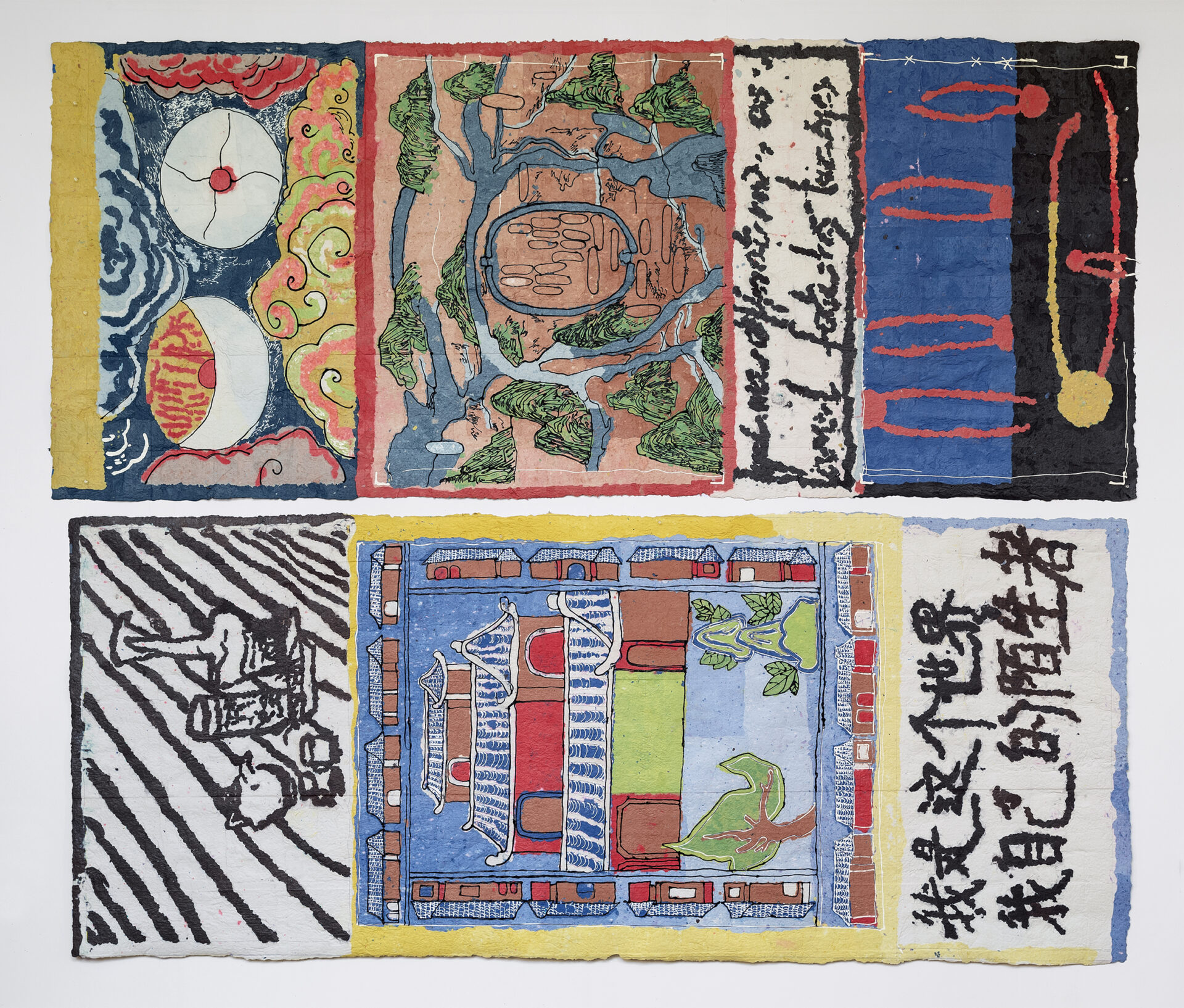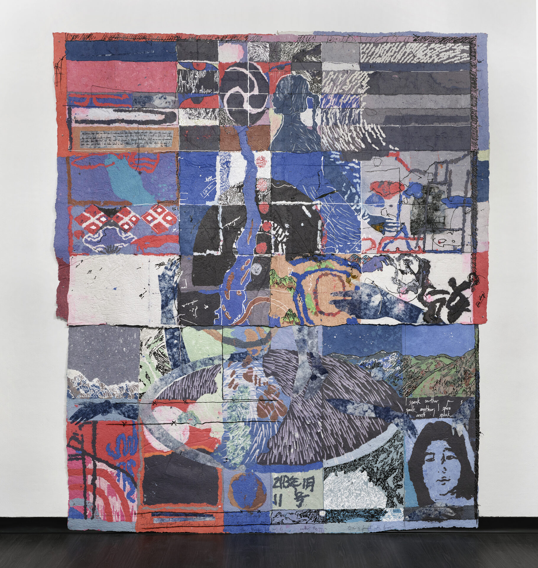 河/River. 2021 - 2024. 109 inches (H) x 174 inches (W) x 45 inches (D). Materials: Hand-formed paper made with repurposed paper products, sun, rain, acrylic paint, Sumi ink, poems, a feather from a Northern Flicker, fallen foliage, and water from the Massachusetts Bay, White Oak Bayou, and Arkansas River.