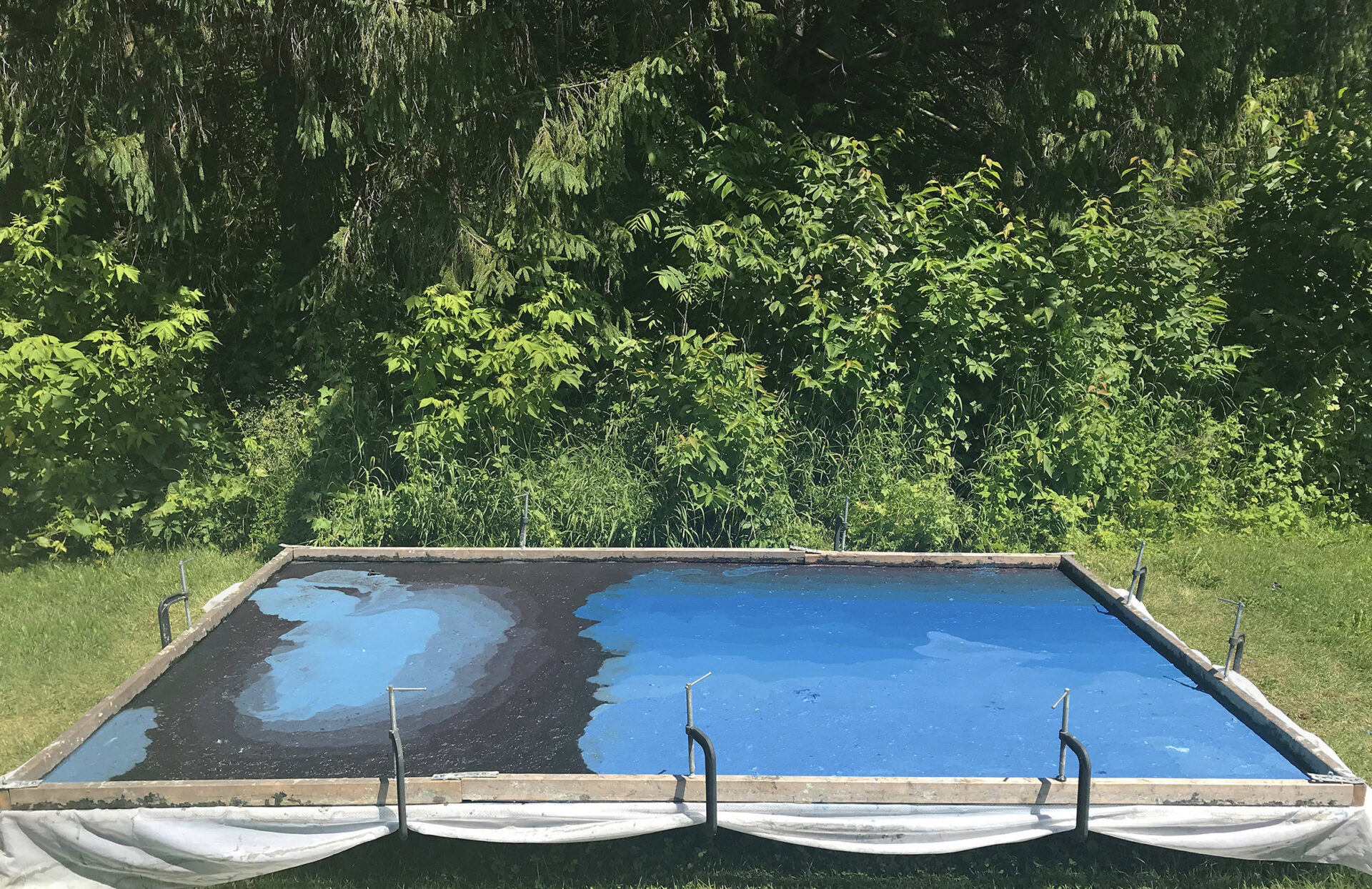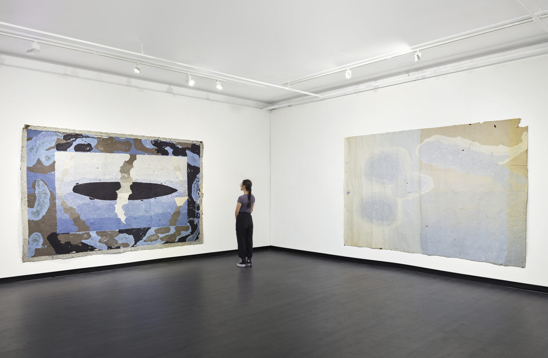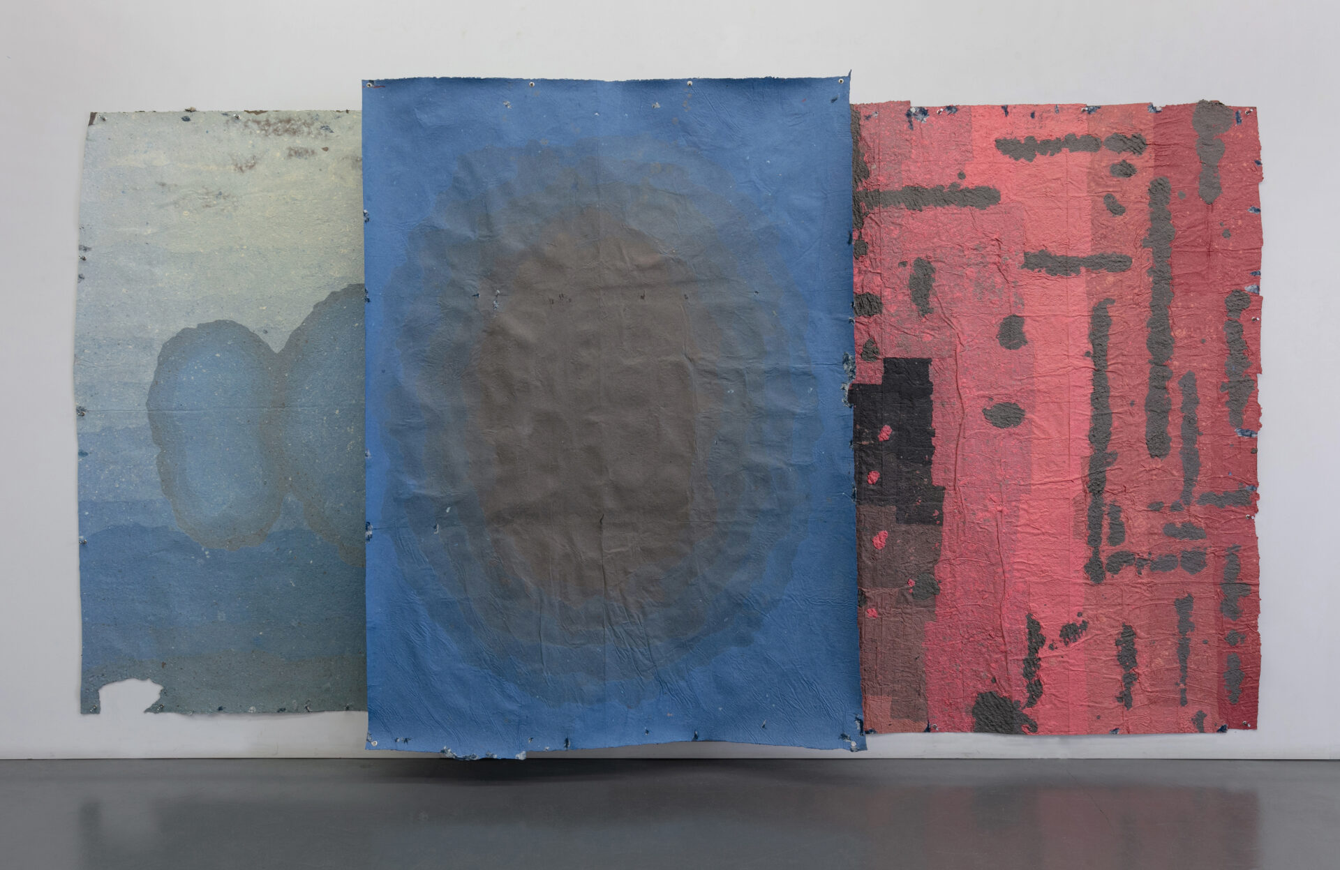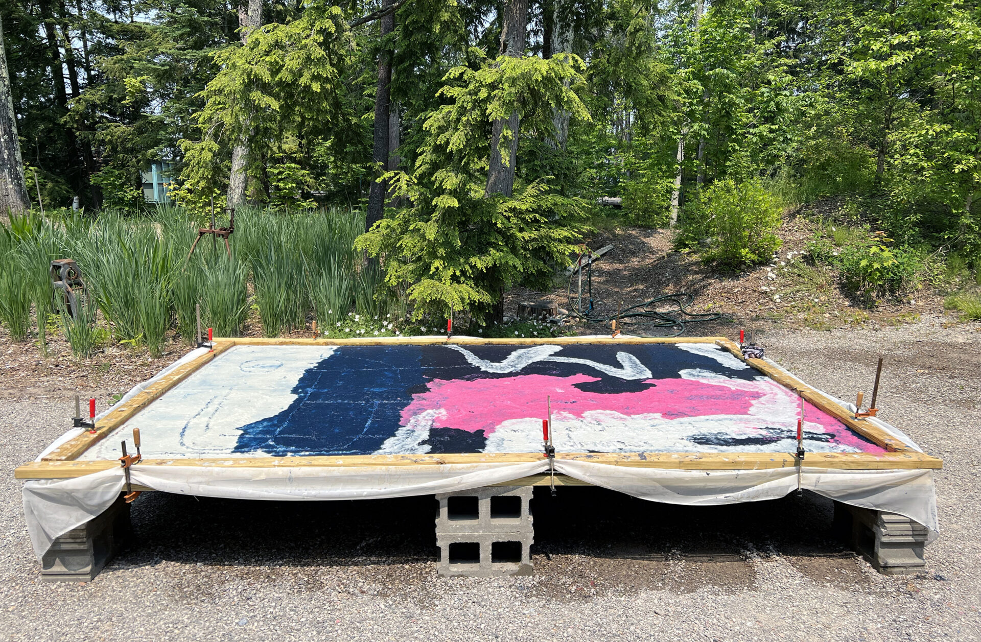 Every summer I go outside to make paper under the sky. Each pour begins at dawn and ends at dusk, marking the birth and death of a single day. During this time, I rotate around a large-scale, rectangular structure, pouring a mixture of rainwater, repurposed paper, foliage and pigment into the frame as I walk. I work with water to build imagery. I use my hands and arms to sense its weight, velocity and direction. I repeatedly push, bend, dip, lower and empty this water. As the wet substances dry outdoors, debris from the surroundings falls onto and becomes a part of the work. Passing weather registers as folds and textures across its surface. Each painting is the cast or transcription of a moment of contact. The act of making a painting is a way to initiate relations between myself and “them”: sky, wind, rain, trees, heat, clouds, memory, history, and sun. They approach me, I move between them.