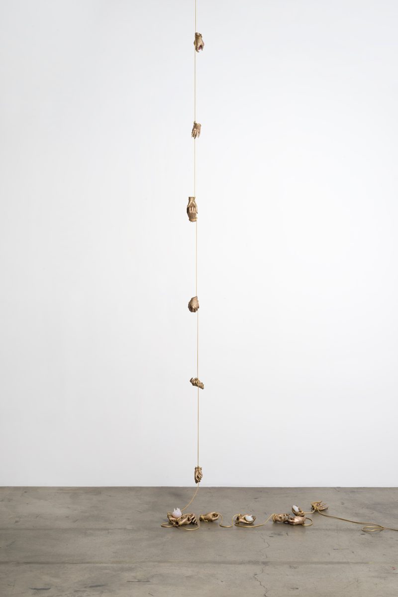 In sculptures and installations that emphasize the reciprocity of touch, Akashi forges experimental, dynamic objects, recalling states of organic transformation, growth, and decay. The Los Angeles artist initially studied photography, and her interest in the photographic process of transformation through time and space moved her to explore candle-making, sculpture, and glassmaking. Akashi’s sculptural universe exists in a perpetual state of metamorphosis, which is illuminated by the self-consuming flames of dripping wax candles and ephemeral light filtering through blown glass objects. Unidentifiable and inexplicably appealing, the deceptively nuanced sculptural bodies call out to be touched and are often held in delicately cast bronze hands.