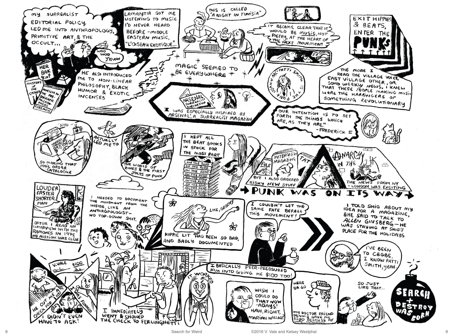 Vale has been a countercultural publisher, writer and punk anthropologist since 1977, and I (Kelsey) have made comics since I was in elementary school in the 90s. We met in 2013 when I was an intern, and have been fast friends and collaborators since we made our first interview comic in 2014. Our comics are about Vale’s life but also about the city of San Francisco and the Bay Area, the wild and ever-changing nature of the freaks and visionaries that have inhabited it, and the evolution of unruly art throughout history. The unpredictable ricocheting of ideas through relationships is what interests us about alternative cultural networks, however briefly they may exist. They are created and kept up by individuals mutually inspiring each other, not by corporations valuing creators for how much profit they can generate. We hope that our comic propels this spirit forward into the future.
