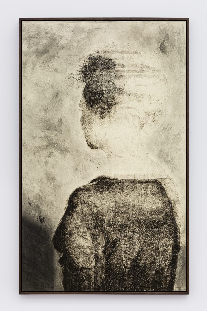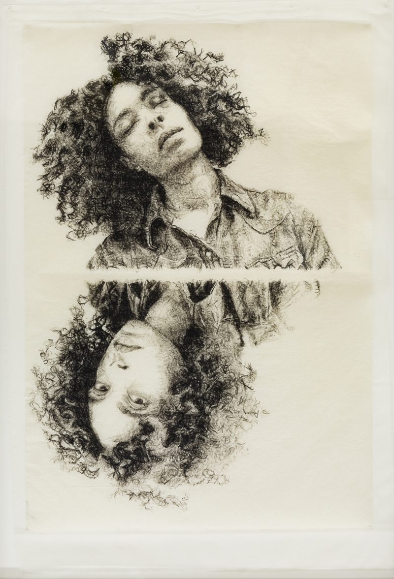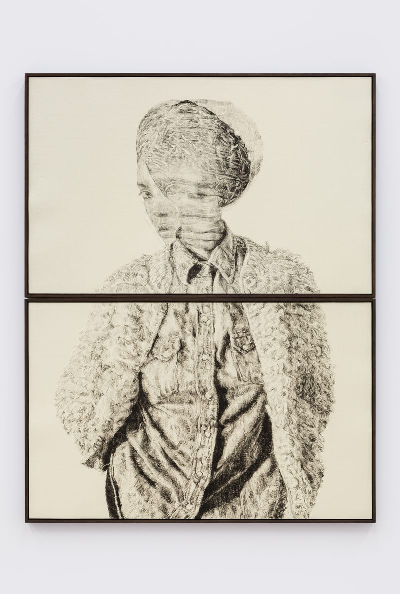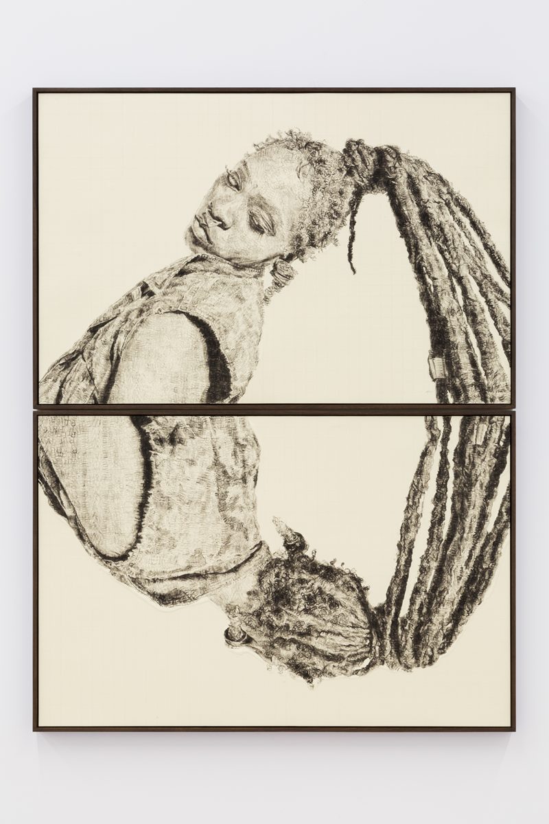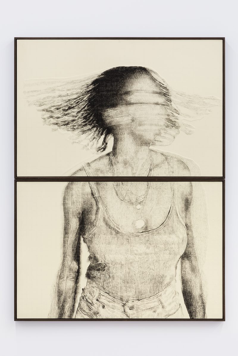 Fundamental to my interest in portraiture is a manner of approaching portraits as vessels capable of carrying and projecting meaning. Rather than paint images, however, I write them, inscribing the histories that entangle us. The repetition and layering of text to the point of illegibility signals the complexities of how we absorb and embody ideas conveyed through language. Understanding that language interferes as much as it aids us in shaping our perceptions, I’ve followed the path of the written line to a woven one to further my investigation outside of figuration. Unconventional looms and other structures incorporate forms and materials that suggest, and occasionally embody, a liminal space. I make forms that blur distinctions like movement and stillness, opacity and transparency, and levity and gravity. While remaining committed to portraiture, my expanding sculptural practice finds strategies outside figuration to explore concepts around the mysterious, the illegible, and the space of things at the edge of perception.