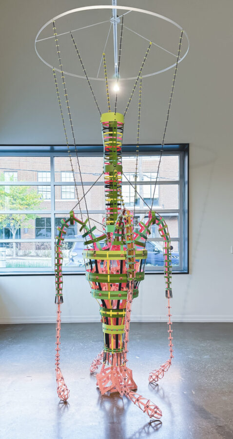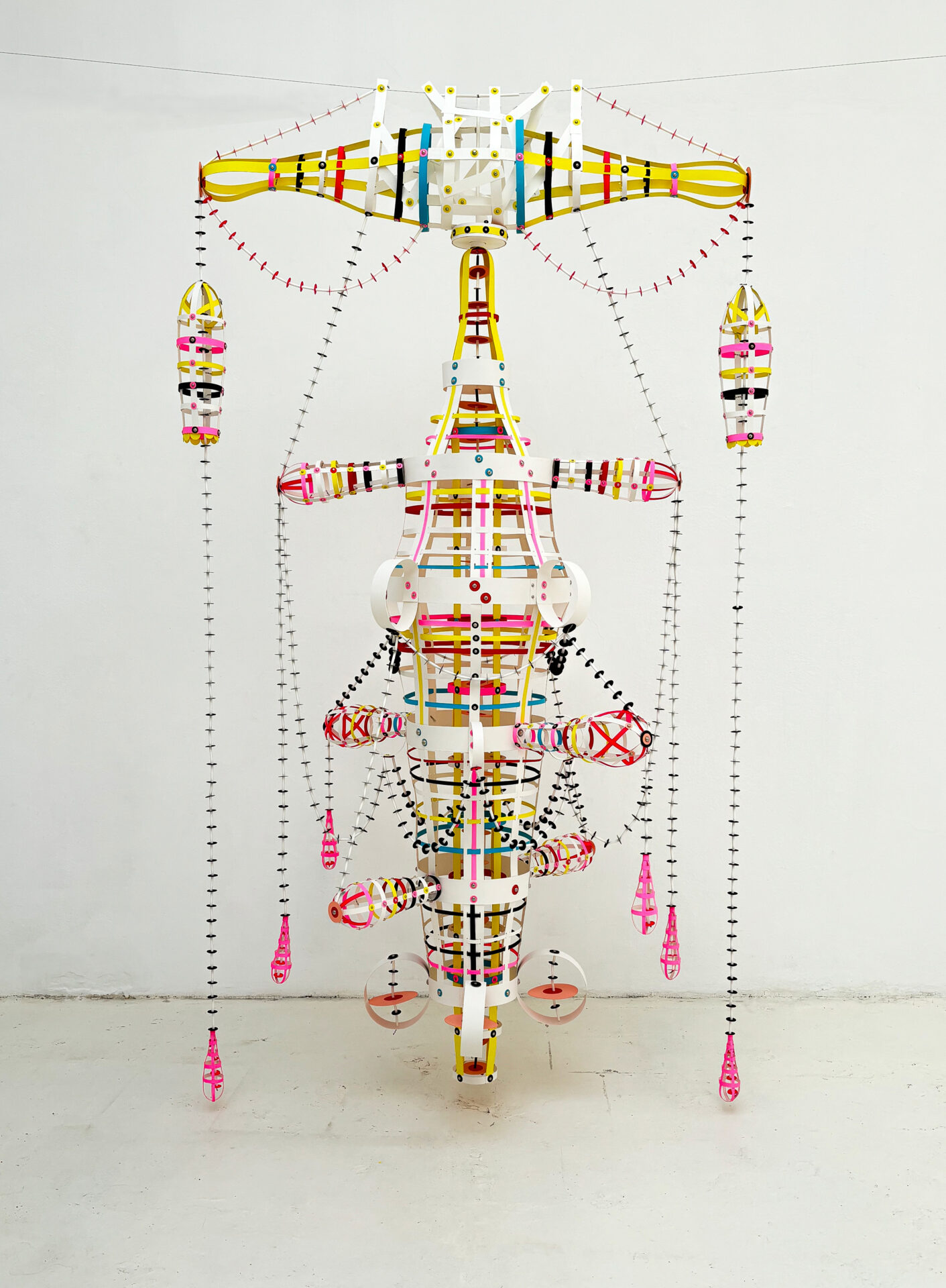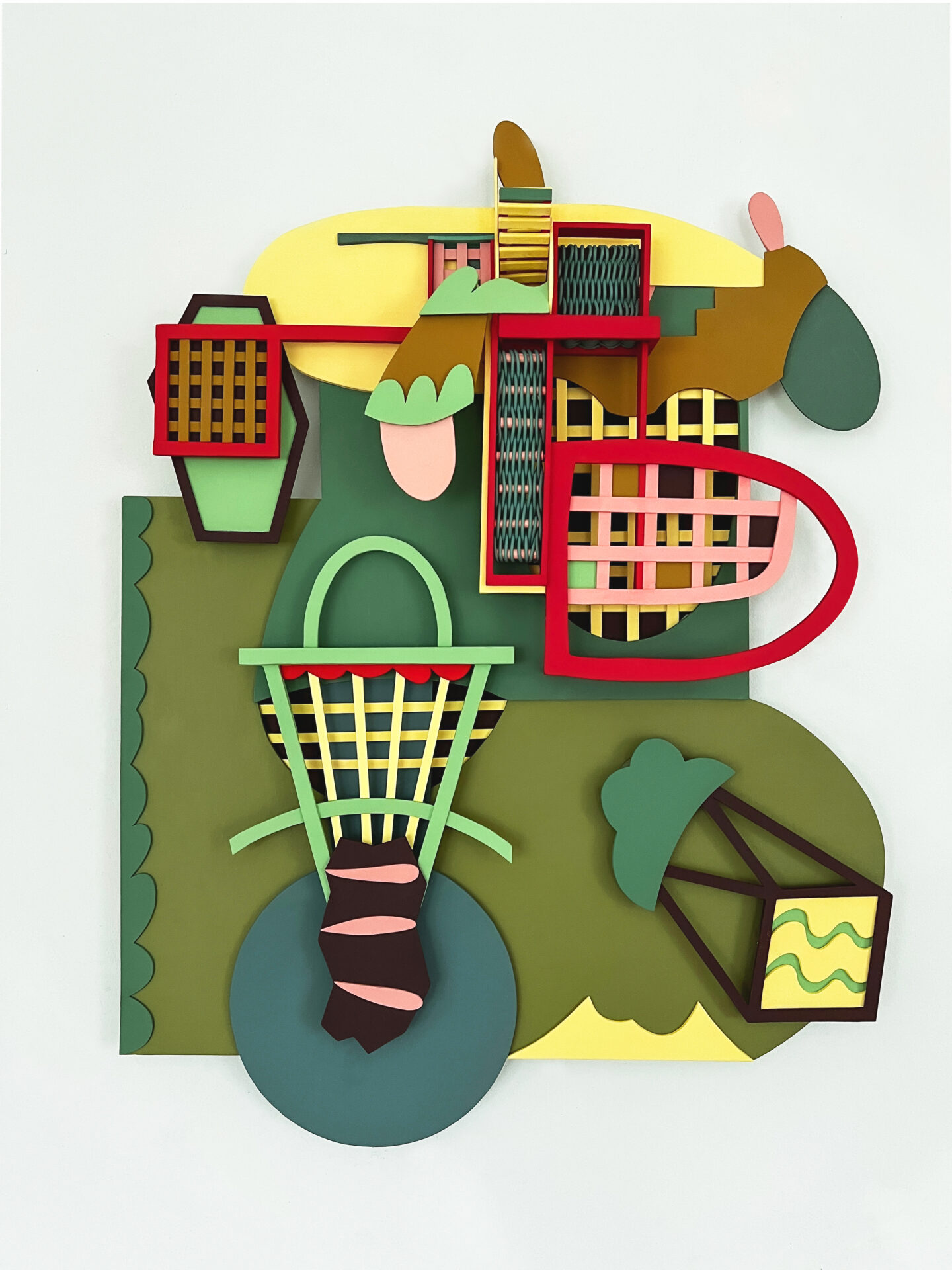My creative process centers on painting, cutting, and assembling paper. My methods are low-tech, relying on accessible materials like paper, glue, and metal brads, which serve both decorative and functional purposes. Paper is economical, portable, and quiet. With simple tools such as hole punches, scissors, and fasteners, I construct by weaving and grid-making. By transforming paper into intricate visual narratives, I explore themes of consumerism and the complexities of contemporary life seemingly hidden beneath playful surfaces. Re-imagining common materials, I strive to create art that is accessible, thought-provoking, and visually engaging, bridging the gap between everyday life and artistic expression.