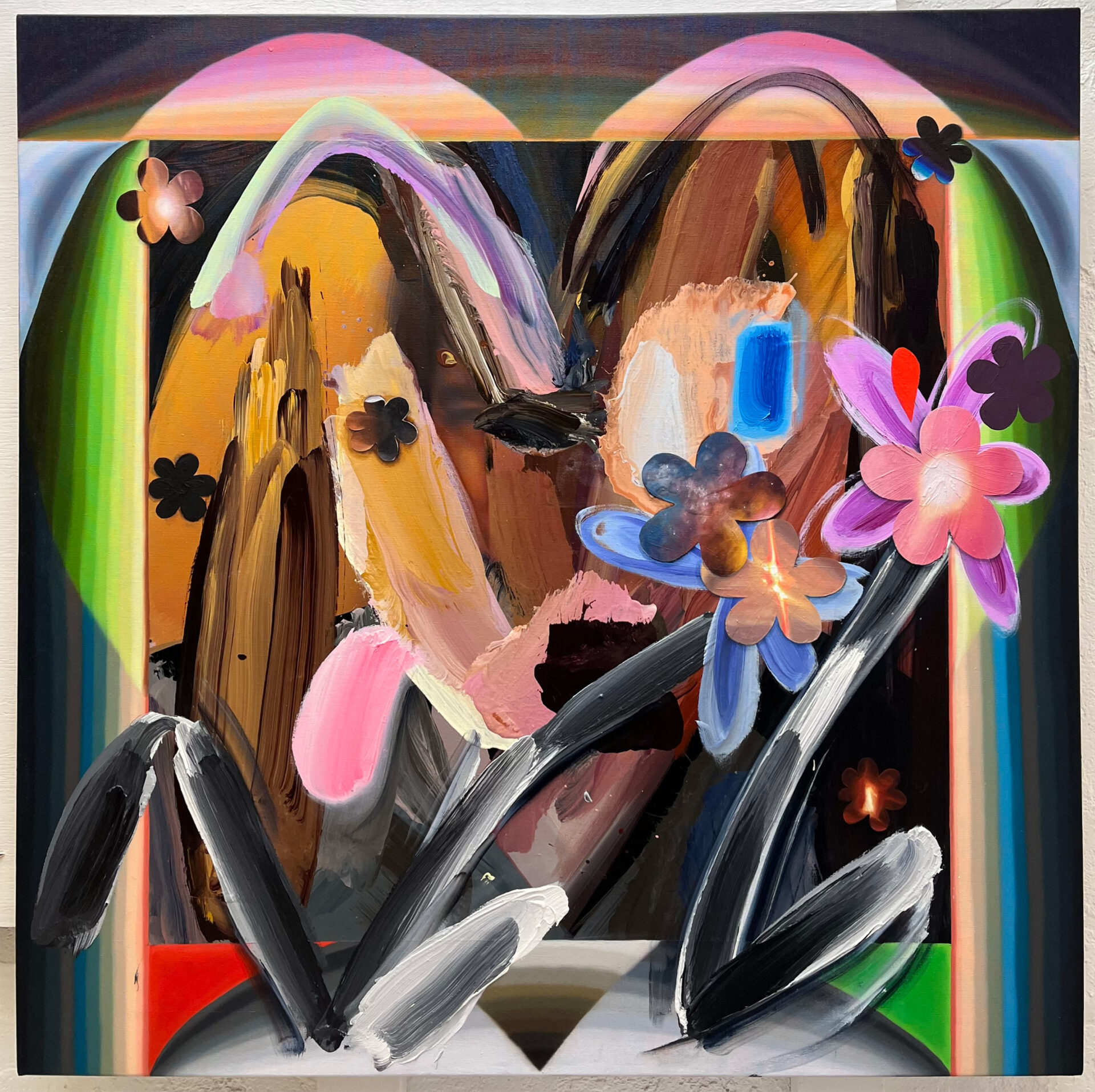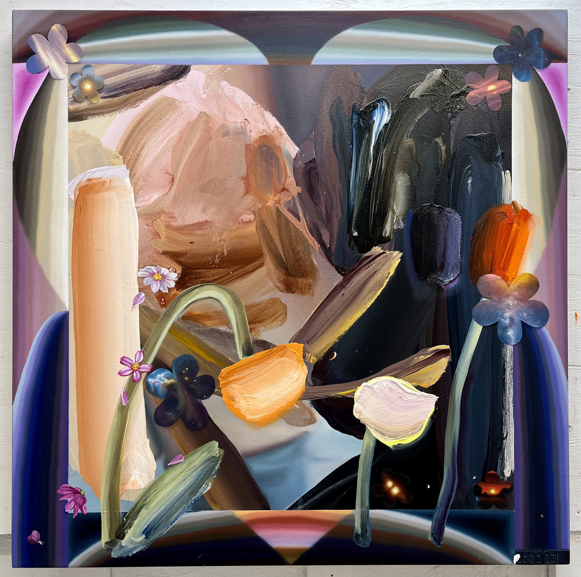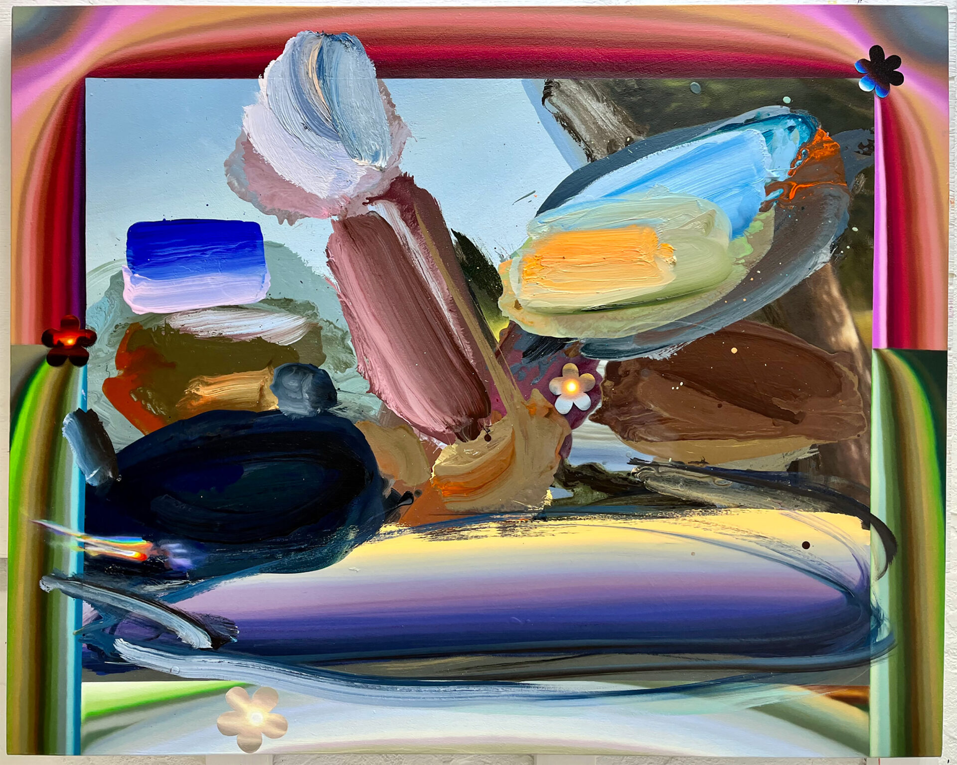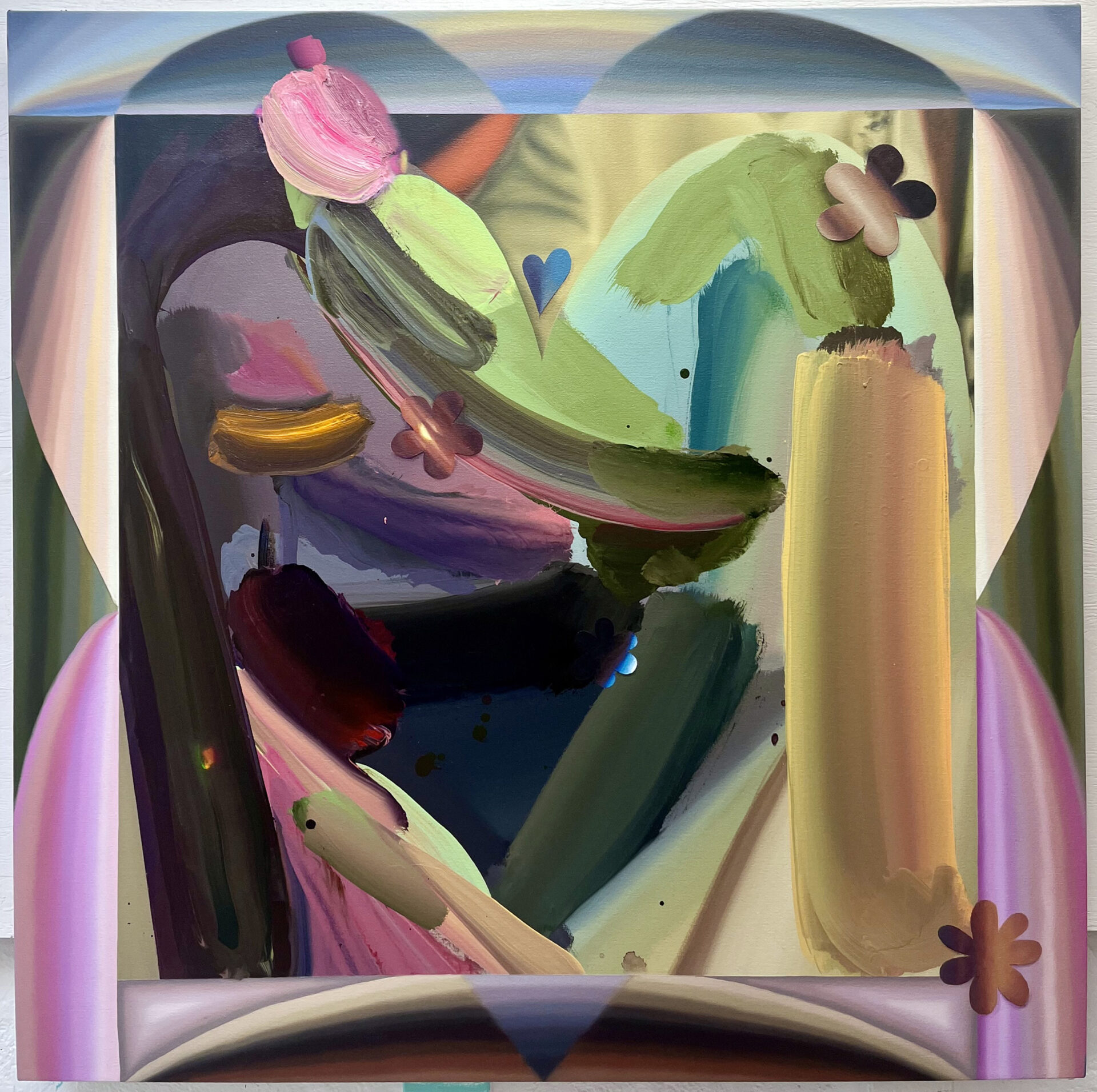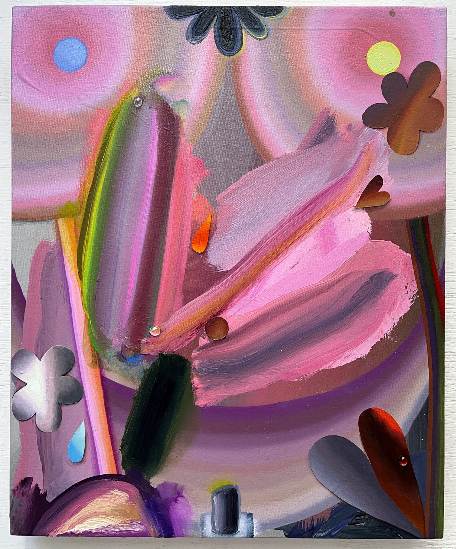 I make luscious, joyful paintings that integrate various painterly languages and approaches to mark, texture, and levels of legibility. This allows for playful slippage between formal and material abstraction, and traditional painterly representation, and allows for disorienting shifts in scale and depth. I think about visually and materially distilling sensate experiences. The works embody transitional spaces between object and image, and meld material and illusionistic space. Cryptic cartoon dog portraits embedded in gradient frames, simplified busty torsos, and bending of light through substances ground the compositions. Color references my experiences looking at photographs, flowers, skies, dogs, hummingbirds, rainbows, postcards, paintings, and more. My moves are inspired by sensual experiences like sniffing, kissing, and crying. I give double meanings to elements, shapes, and symbols through legibility of form. A trompe l’oeil teardrop becomes a dog’s ear or a flower petal. A cosmos flower is a portal into the greater cosmos.