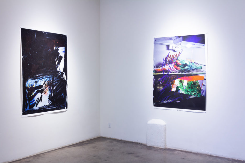 Left: Kristen Wong, "true love (after anna nicole)," 2022; Archival inkjet print, Brett's nicotine, crayon. Right: Kristen Wong, "holly's flowers," 2022; archival inkjet print, crayon, my nicotine, gouache. Photo by Perry Doane.