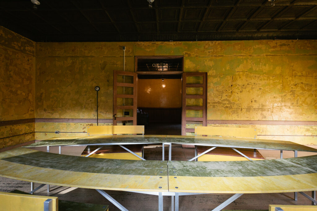 Ireland and his crew sandblasted the layers of paint off the stamped-tin ceilings and pillars, and using sandpaper, solvents, and even dental tools, picked the paint off the beautiful stairwell, railings, and banisters. In the Eastwing they stripped the walls down to the original plaster and the baseboards to their fine wood. In the Rodeo Room, they sandblasted through many layers of color, stopping at the richly mottled greens and ochres that are now visible. They repaired the ancient wiring, reinstated running water, and installed lights. Finally, they polished, varnished, and sealed the original surfaces they’d revealed.